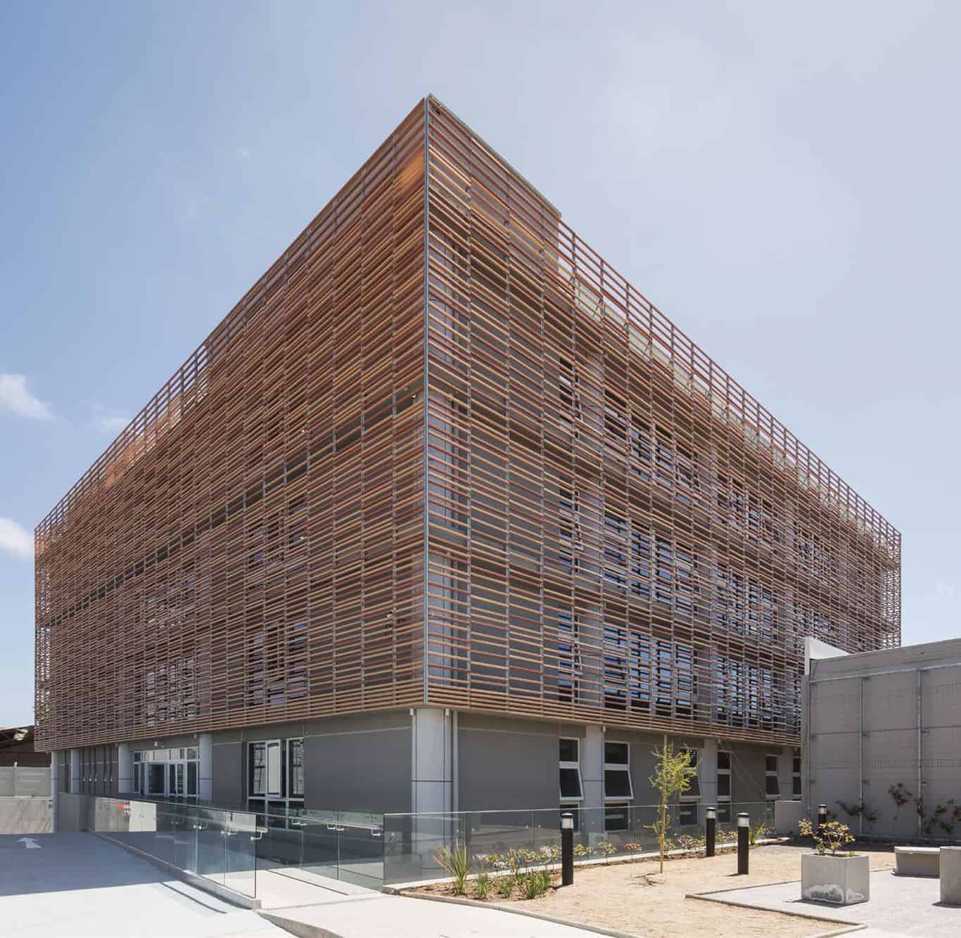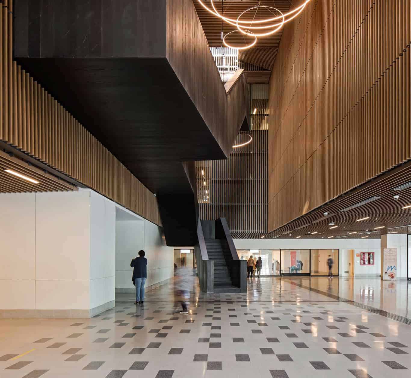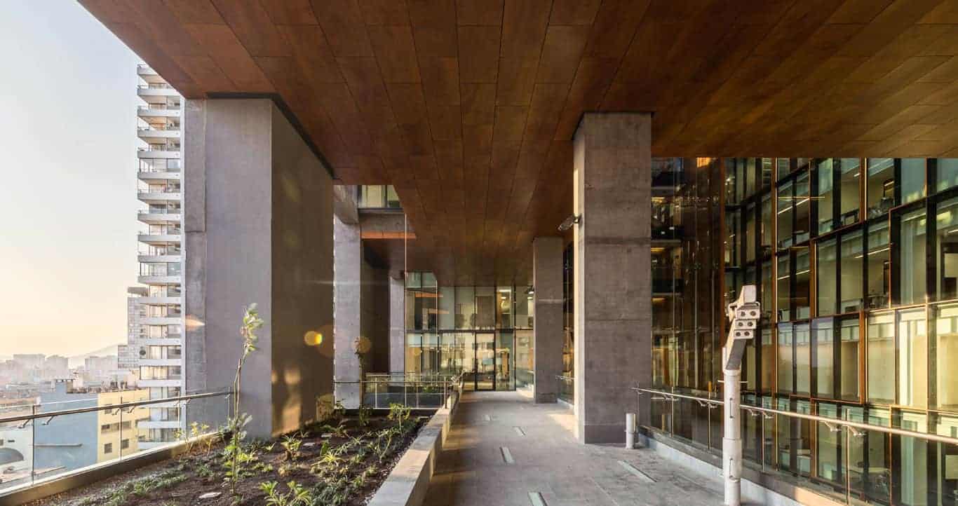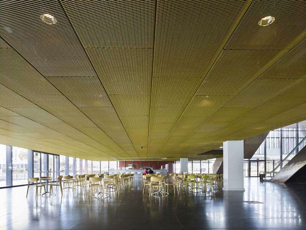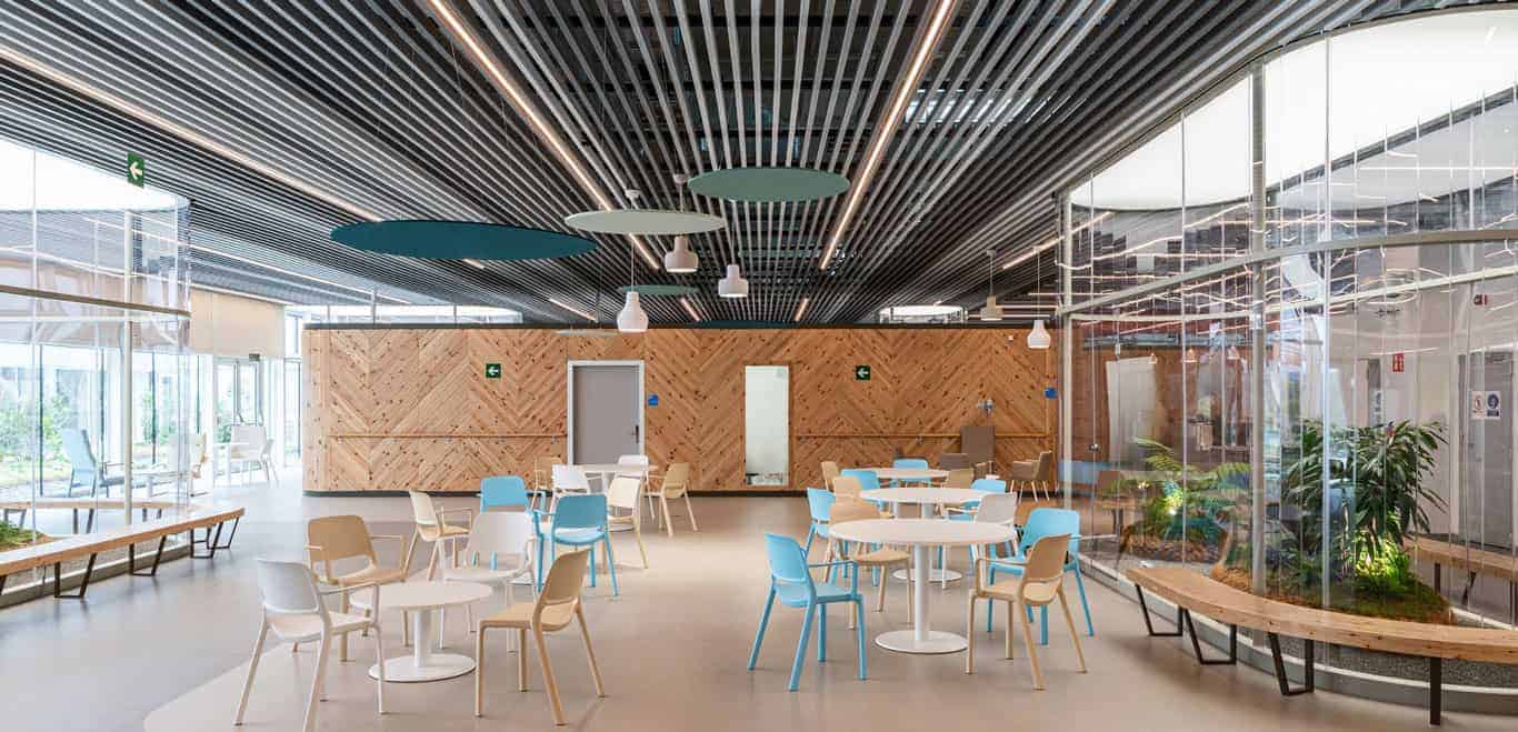 Interiores con Confort Acústico y Estética Natural: Se incluyen soluciones de alto confort acústico y visual para cielos y revestimientos interiores, con sistemas modulados metálicos o de madera que combinan funcionalidad e impacto estético en oficinas, hospitales y espacios públicos.