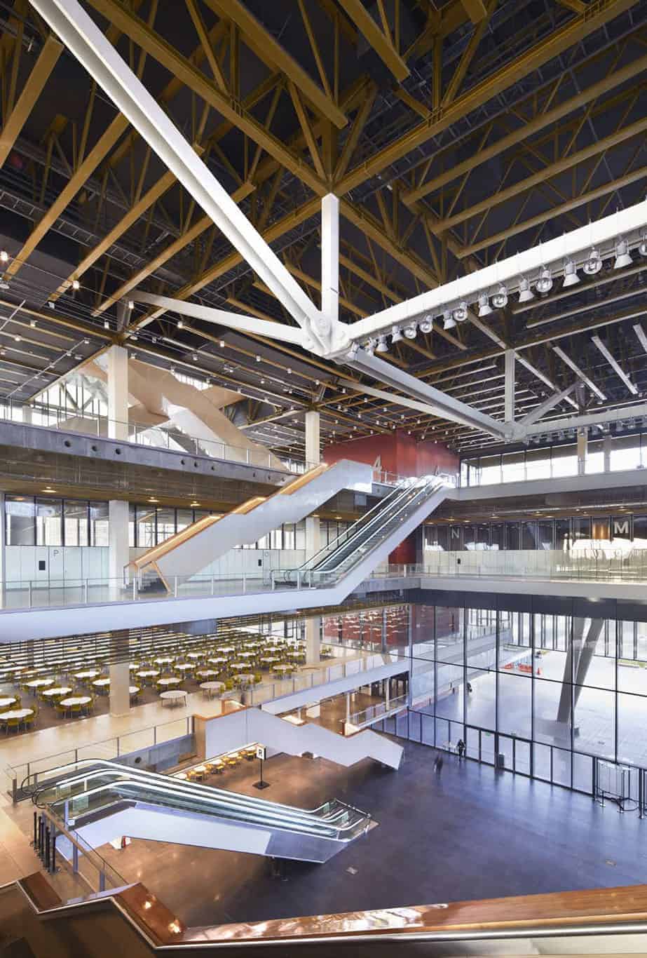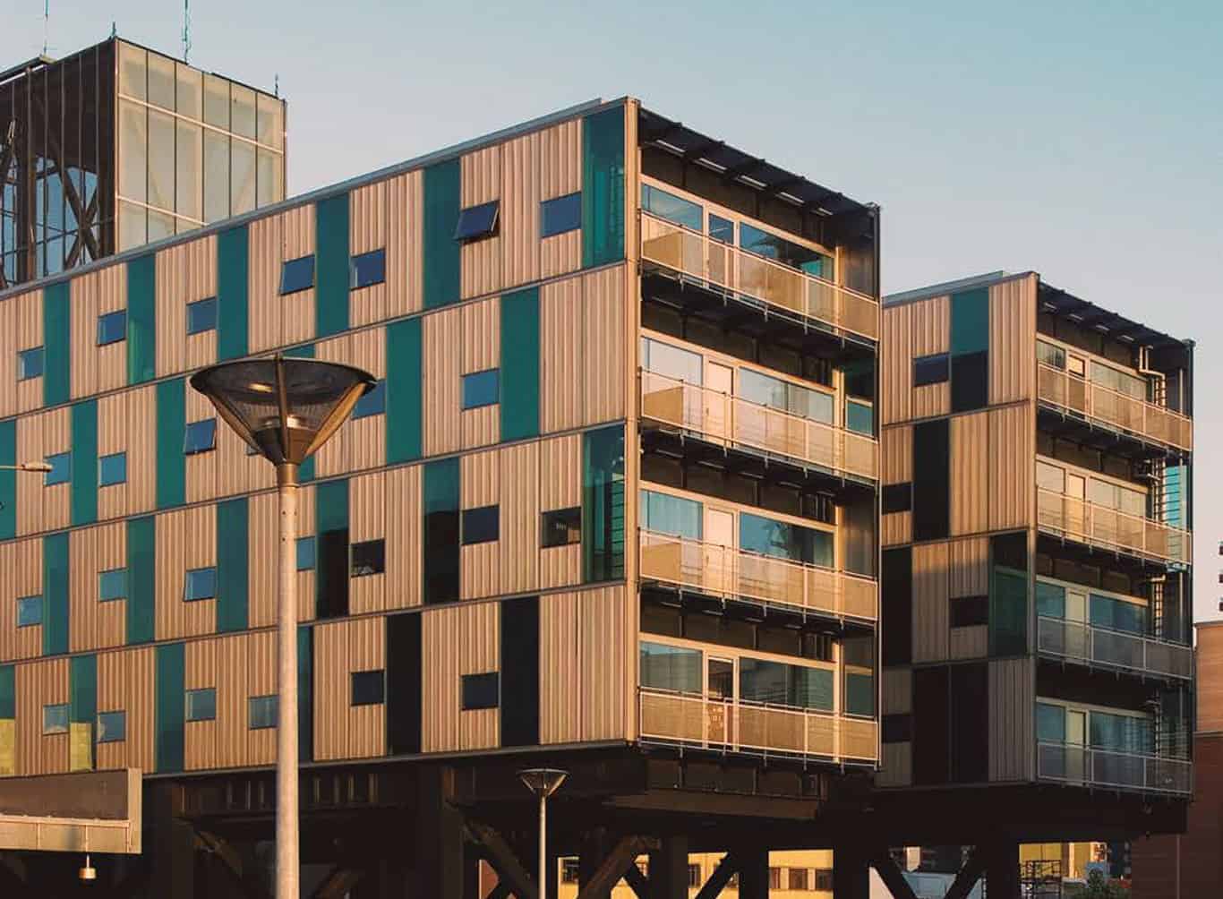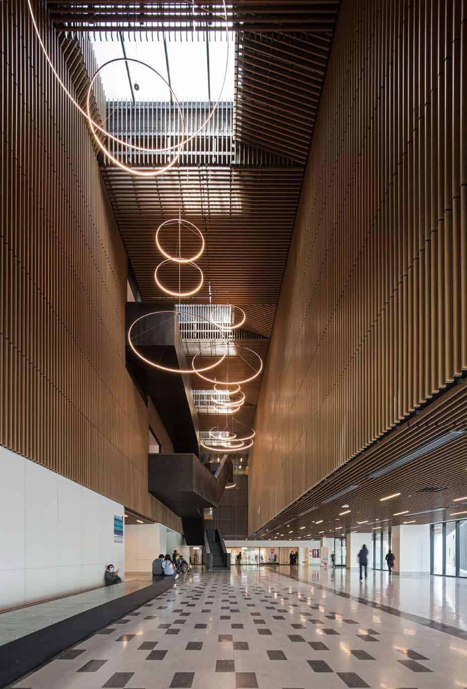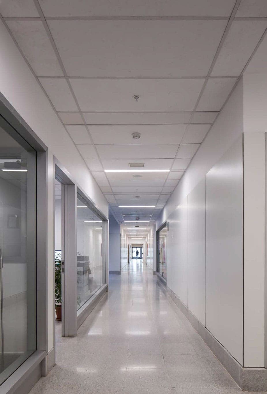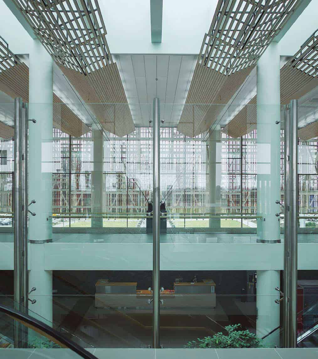 Interiores con Confort Acústico y Estética Natural: Se incluyen soluciones de alto confort acústico y visual para cielos y revestimientos interiores, con sistemas modulados metálicos o de madera que combinan funcionalidad e impacto estético en oficinas, hospitales y espacios públicos.