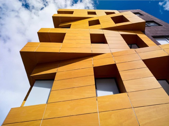 El revestimiento ProdEX de Parklex Prodema es una generación de productos de paneles para fachada ventilada de tipo HPL para exteriores con chapas de madera natural.