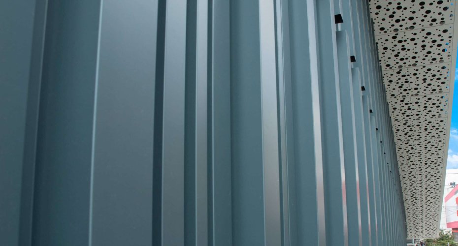El revestimiento GeoClad está fabricado con una tecnología de plegado exclusiva de Hunter Douglas que permite obtener pliegues ortogonales y una serie de patrones lineales permitiendo generar continuidad en fachadas, muros y techos con diseños exclusivos, elegantes y distintivos.