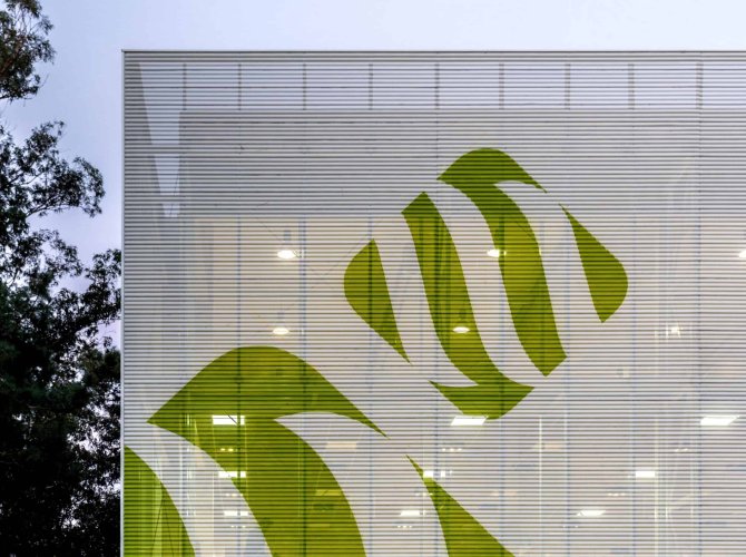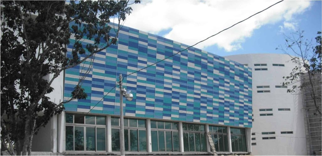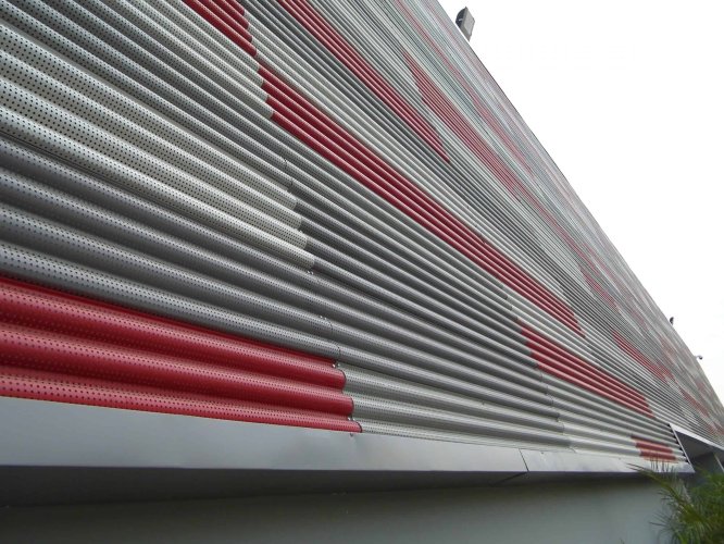 El revestimiento Softwave para fachada se compone de paneles de líneas curvas de radio de onda y puede ser instalado liso o perforado