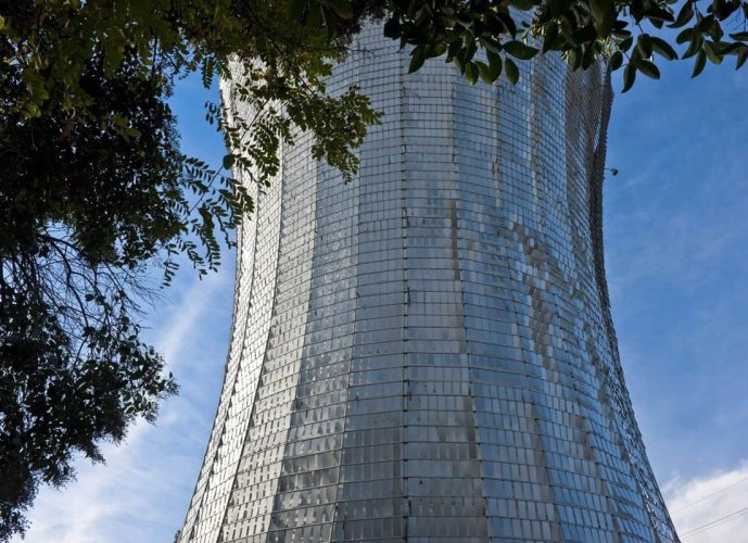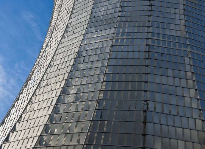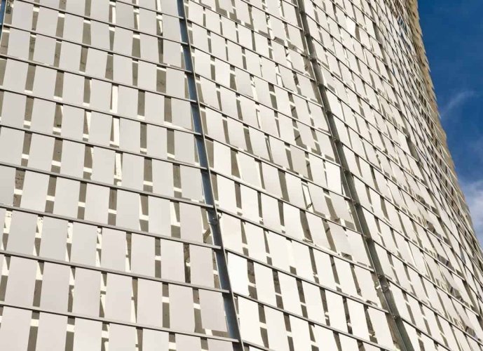 Los paneles del cortasol WindScreen forman una superficie se que mueve con el viento, esta cualidad entrega una fachada cinética siempre cambiante y visualmente muy atractiva.