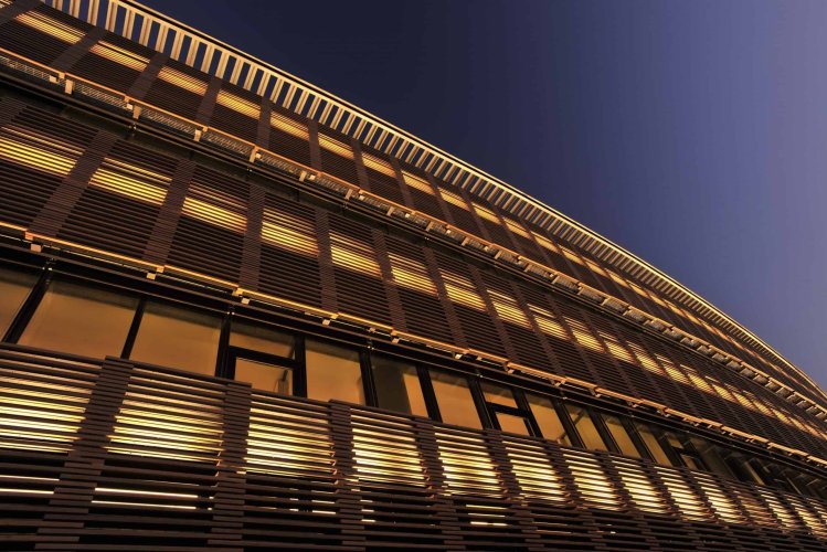 El cortasol Woodbrise está compuesto por un conjunto de paletas con acabado en chapillas de madera tratada